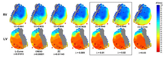 Figure 6 shows the activation time maps of a beat for which L-Curve, CRESO, and ZC achieved the highest CC, together with the corresponding maps when a fixed value of equal either to 0.009, 0.01, 0.02, or 0.03 is used, for comparison. It can be noticed that both and 0.02 achieve the highest CC among the four fixed values. Results also show that the CC achieved with is comparable to those achieved with L-Curve, CRESO, and ZC, and the activation maps are very similar upon visual inspection. Moreover, all three methods achieve the highest CC for values very close to 0.01, thus supporting the evidence of this being a suitable value to be chosen for the zero-order Tikhonov regularization of the inverse problem in electrocardiography.