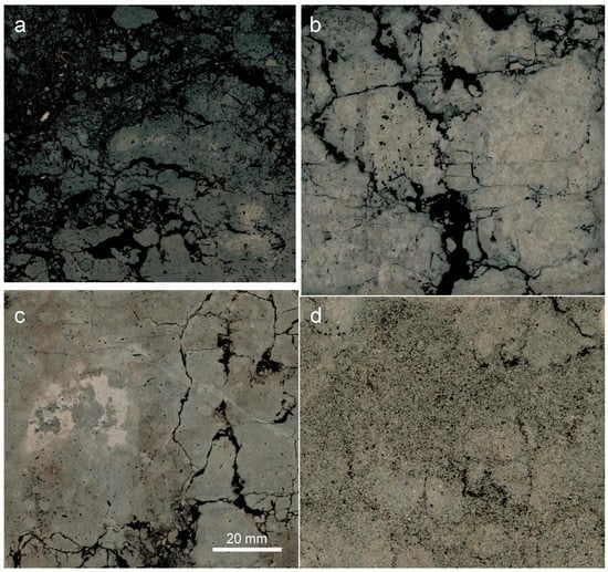 Representative images of soil macrostructure to demonstrate the MP5 classes; pores are marked with black. (a) CM02.A, MP5 = 1, (b) LV04.E, MP5 = 2, (c) PH05.C, MP5 = 3, (d) PZ07.C, MP5 = 4.