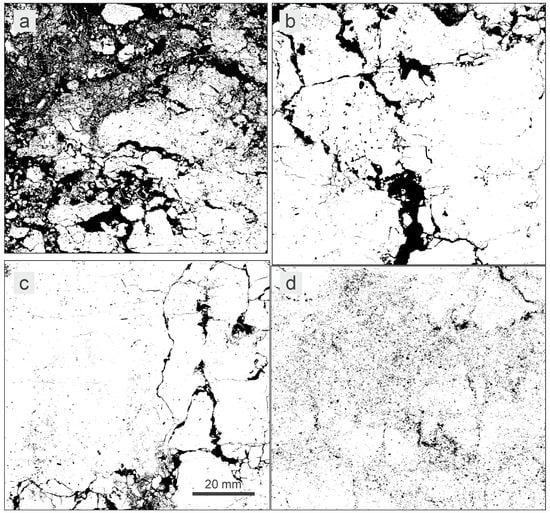 Binary images of soil macrostructure corresponding to the images shown in Figure 1; pores are marked with black. (a) CM02.A, (b) LV04.E, (c) PH05.C, (d) PZ07.C.
