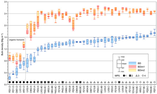 The bulk density measured using the soil cores (BD) and the bulk density calculated from the image analysis (BDim1 and BDim2) are presented in Figure 4. BD ranged from 0.249 to 1.747 Mg m−3. The bulk densities by image analysis were always higher than the bulk density measured in the core samples. Namely, BDim1 ranged from 0.711 to 2.596 Mg m−3 and BDim2 from 0.833 to 2.560 Mg m−3. Organic horizons had the lowest BD, BDim1 and BDim2. The bulk densities by image analysis showed a similar trend to the bulk density by core samples. In addition, the classes of quantity of pores ≥5 mm (MP5) were marked in the graph. As expected, the samples with the highest content of large pores had the lowest bulk densities.