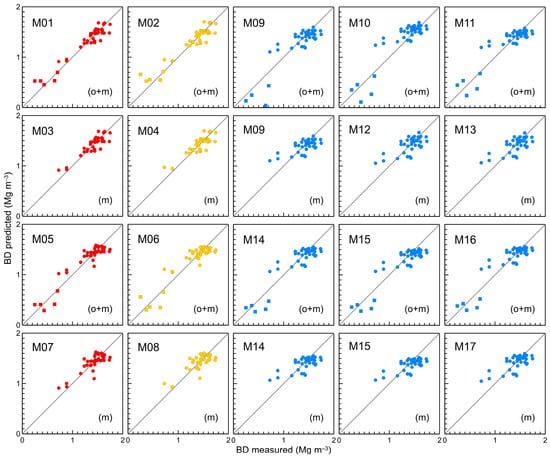 Measured vs. predicted bulk density by the M01–M17 pedotransfer functions with reference to the 1:1 line (training set). Circles—mineral horizons, squares—organic horizons. M01–M08: yellow and red symbols—pedotransfer functions developed with BDim1 and BDim2, respectively.