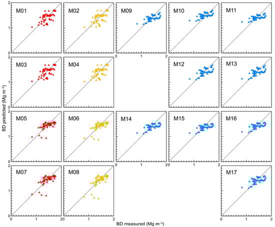 Comparing M09–M17 with the models M01–M08, we observed that M09–M17 were characterised by a bias of the BD predicted against BD measured, consisting in an overestimation of the bulk density for low values and an underestimation for high values. Moreover, the main axis of the observed data-point cloud rotated clockwise with respect to the 1:1 line. This behaviour is characteristic of the TOC-based PTFs, as confirmed by previous studies, for example [23,26,42].