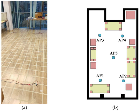 Measurement setup of the first scenario: (a) environment; (b) schematic drawing.