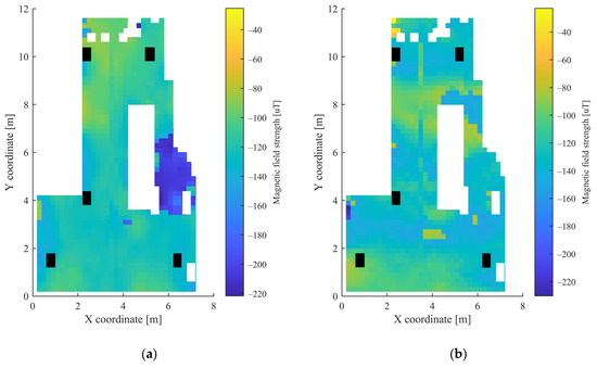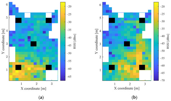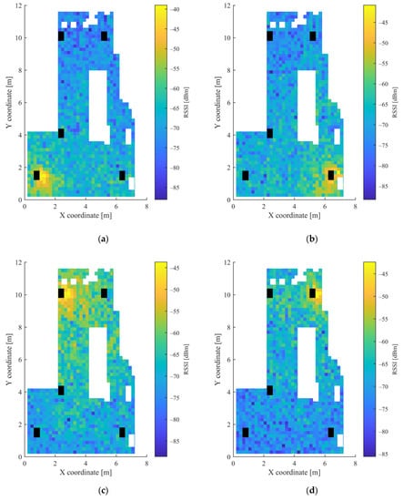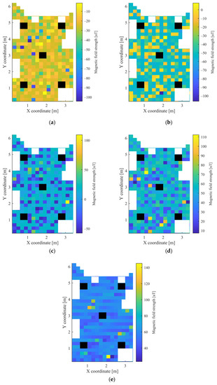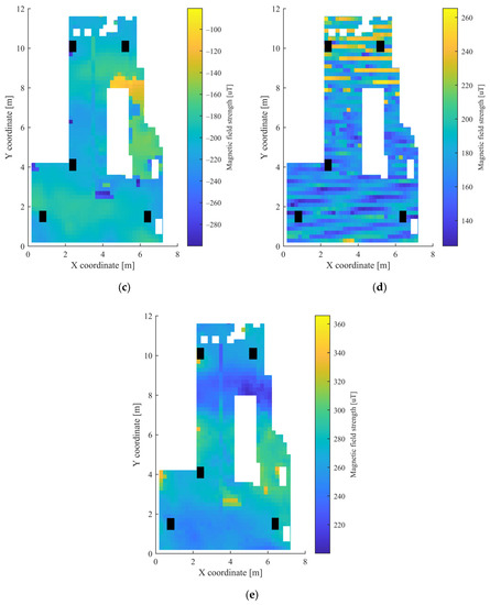 In the grid, which was used to determine the measurement points, squares with a side length of 20 cm were defined. The height of both the mobile unit and the APs was 4 cm. Altogether 426 points were used for data acquisition. The mobile node was moved manually between the measurement points and there was no one in the room during the measurements. The measurements were collected over the course of one day. The heatmaps of the collected RSSI measurements for the 5 APs and the magnetometer data are shown in Figure 3 and Figure 4, respectively. The white parts in the figures represent the places where measurements could not be taken due to the obstacles, while the black rectangles show the positions of the APs.