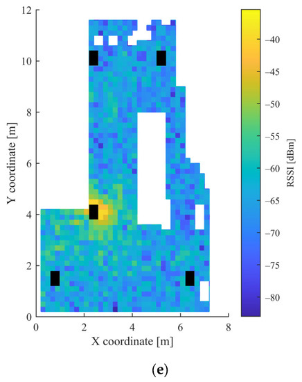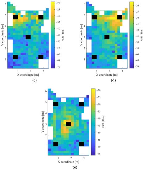 Heatmap of RSSI values in the second scenario for: (a) AP1; (b) AP2; (c) AP3; (d) AP4; and (e) AP5.
