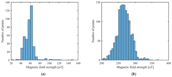 Histogram of the Bxyz magnetic field magnitude for: (a) first scenario; and (b) second scenario.