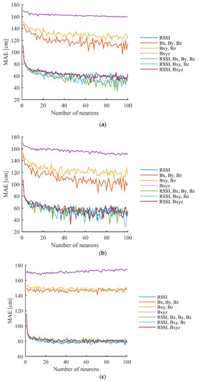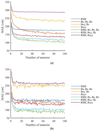 The best achieved MAE results and the corresponding STD and RMSE results, using different versions of data for the two datasets in the case of the first scenario, are summarized in Table 2. It can be observed from the results that using the proposed method, the errors significantly decrease in the case of the training data. Using datasets where all points were used as training data, significant improvements were achieved using the versions that utilized RSSI, Bx, By, Bz and RSSI, Bxy, Bz, compared to results where only RSSI was used. Here, the MAE decreased from 50.71 cm to 34.64 cm and 41.68 cm, respectively. In the datasets where every second point was utilized, the MAE using only RSSI was more than 10 cm lower than when all points were used. The improvement caused by the fusion with magnetometer data was 7–10 cm, using any version. It should be noticed that when using the RSSI, Bxy, Bz version, an MAE more than 2 cm lower was achieved than with the other two fusion-based versions. In the case of test data, no improvement can be noticed since the RSSI and the fusion-based versions provided nearly the same results. This can be caused by the low variance of the magnetic field measurements in this scenario, and the large distances between the points due to the usage of every second point. The achieved results using only magnetometer data in this scenario show a much lower performance than the other versions.