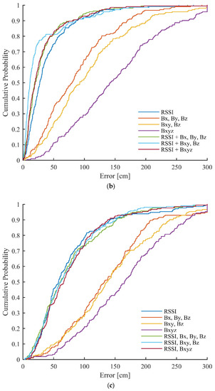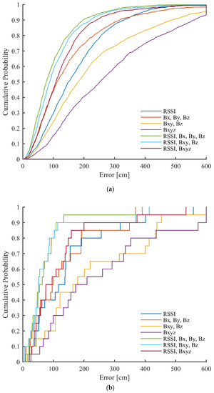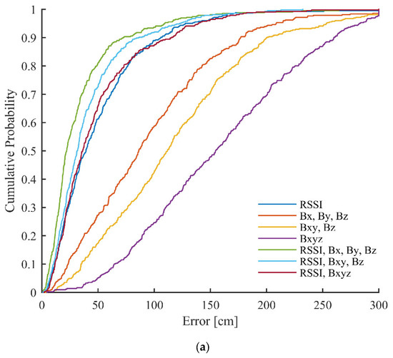The cumulative density functions (CDF) of errors for the different used versions of data can be seen in Figure 10. The errors larger than 300 cm were truncated. It can be noticed that the proposed method significantly improves the error distribution in the case of the training data. For example, when using all grid points for training, around 60% of points give below 50 cm errors with only RSSI, which increases to ~70% and ~80% using RSSI, Bxy, Bz and RSSI, Bx, By, Bz, respectively. With the test data, the fused versions provide almost identical curves, as with using only RSSI.