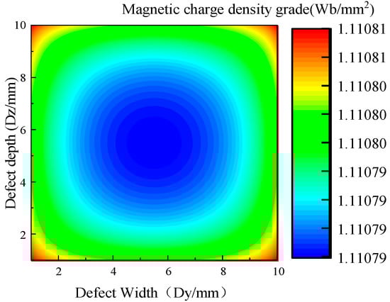where the uniform magnetic charge density is [27]. The magnetic charge at the defect is affected by the shape of the defect, and the magnetic charge in the stable state presents a non-uniform distribution under the action of Coulomb force [28,29], which is difficult to overcome. As shown in Figure 1b, the rectangular defect with the defect side length dy × dz is divided into m × n sub-regions, and the side length of each sub-region is . Therefore, only the magnetic charge carried by each sub-region is required, and the distribution of the magnetic charge density in each sub-region can be calculated as [30]: