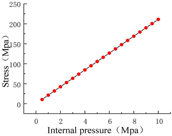 where Q is expansion coefficient, p is the internal pressure, R is the radius of pipeline, t is the wall thickness of the pipeline, and Dy is the defect depth. In addition, F is the stress intensity factor at the crack tip and only depends on the crack size and internal pressure. The radius R of the pipelines was 259 mm, the wall thickness t was 12 mm, the defect depth was 10 mm, the axial length was 1 mm, and the internal pressure of 0.5~10 MPa was applied to the pipeline. The calculated stress is shown in Figure 3.
