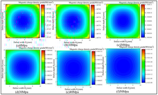 The stress concentration area at the defect leads to the change in the magnetization of the side wall of the defect. In the present study, the defect sizes were designed with length Dx = 1 mm, width Dy = 10 mm, and depth Dz = 10 mm, and tensile forces of 0, 10, 20, 30, 40, and 50 MPa were applied to analyze the variation pattern of the magnetic charge density under different stresses. Figure 4 shows the distribution of the magnetic charge density on the side wall of the defects under stress.