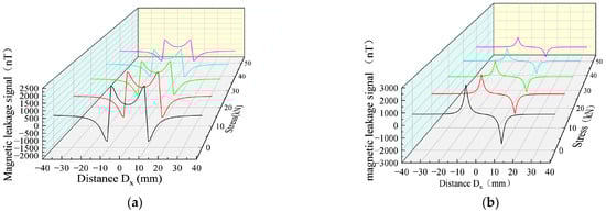 Changes of MFL signals under different stresses. (a) Axial components of MFL signals under different stresses. (b) Radial components of MFL signals under different stresses.