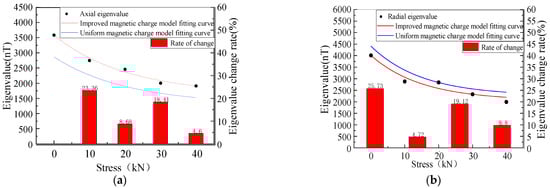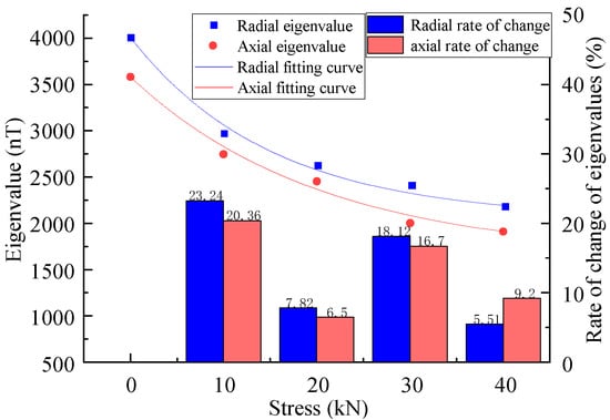 The results showed that the eigenvalues of the MFL signals decreased nonlinearly with the increase in the stress, where the rates of the change in the axial component eigenvalues were 20.36%, 6.5%, 16.7%, and 9.2%, and the rates of the change in the radial component were 23.24%, 7.82%, 18.12%, and 5.51%, yielding a larger rate of change in the radial component eigenvalues, which exhibited more sensitivity to stress changes (Figure 7).