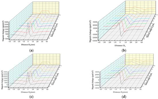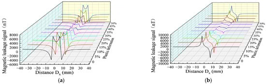 In the transportation process of long-distance oil and gas pipelines, the wall of the pipeline is in continuous stress under the action of long-time stress, and the plastic deformation of the defects is noteworthy. In order to study the variation trend of the MFL signals in the plastic stage, the MFL signals were analyzed under the plastic deformation values of 0%, 5%, 10%, 15%, 20%, 25%, 30%, 35%, 40%, 45%, and 50% (Figure 8).