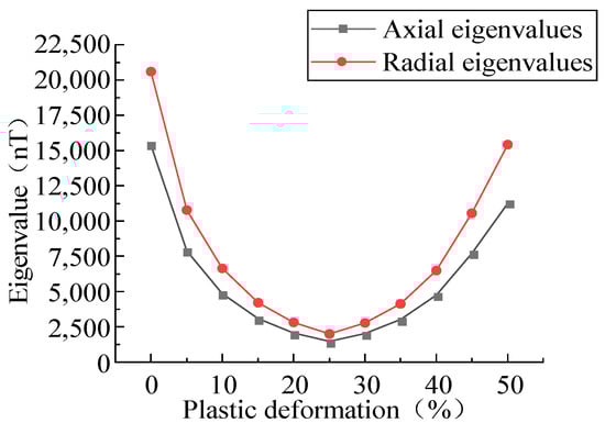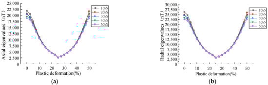 With the increase in the plastic deformation, the MFL signals presented an upward trend, followed by a downward trend. The eigenvalues of the axial and radial components in the plastic deformation were extracted (Figure 9).