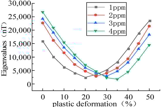 In the plastic stage, the intensity of the MFL signals decreased with the increase in the stress, initially decreased and then increased with the elevation of the plastic deformation, and an inflection point was found in the plastic deformation of 0.2–0.3 (Figure 10). As the magnetostriction coefficient λs is material-dependent, λs was analyzed and a tensile force of 10 kN was applied with magnetostriction coefficients λs of 1, 2, 3, and 4 ppm (Figure 11).
