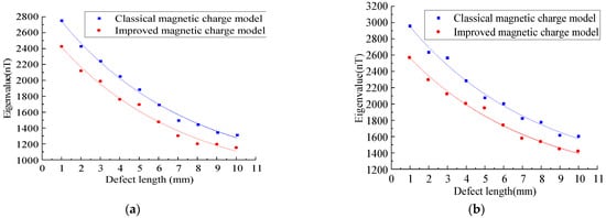 As shown in Figure 12, the improved magnetic charge model and the classical magnetic charge model decrease with the increase in the defect length, the axial component has a double peak value, and the distance between the peak and valley values of the radial component becomes larger, and the change trend is consistent. As shown in Figure 13, the variation rule of the eigenvalues is studied.