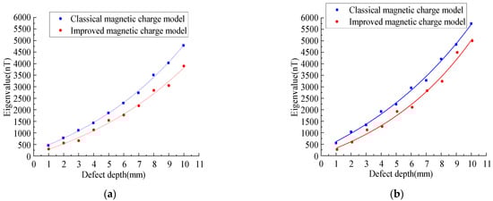 As shown in Figure 15, it can be seen that with the increase in the defect depth, the eigenvalues increase nonlinearly, and the eigenvalues of the improved magnetic charge model are smaller than the classical magnetic charge model.