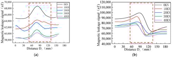 Uniform tensile forces of 0, 10, 20, 30, and 40 kN were applied to the steel pipe, and the magnitudes of the MFL signals were recorded. Figure 17 shows the MFL signals of the axial and radial components of the X70 specimen in the elastic stage under different tensile forces.