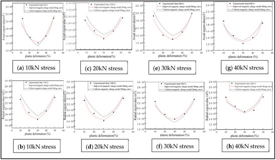 It can be concluded from Table 2 that the average accuracy of the eigenvalue of the axial component of the improved magnetic charge model was 84.55%, and that of the radial component was 86.1%. The average accuracy of the eigenvalues of the axial component and the radial component of the uniform magnetic charge model was 75.4% and 77.1%, which increased by 9.15% and 9%, respectively. Therefore, the model can be used to predict the variation pattern of the characteristic values of MFL signals in the plastic deformation stage under different stresses.