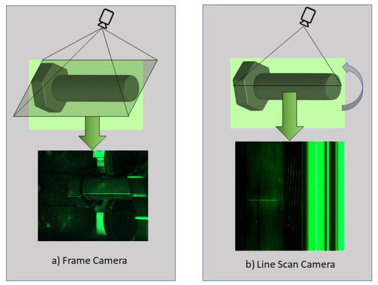 We collected a new fastener defect dataset using a DALSA Linea 2k 7.04 um 2048 × 2−26 kHz-Color line scan camera since the frame cameras have their limitations in resolution and high-speed imaging applications. Unlike a frame camera, which exposes the entire area of the sensor and gives an entire image, a line scan camera exposes just a single line of pixels. These single lines of pixels are stitched together to form a complete frame. As opposed to frame cameras, line scan cameras need special optic systems. We used 12 mm fixed focal length lenses and 600 mm field of view (FOV). In our study, the linear array camera was used to capture MPI images because it allows for a larger field of view and a higher resolution compared to an area array camera. Additionally, linear array cameras have higher sensitivity and signal-to-noise ratio, which is important for detecting small defects. Furthermore, linear array cameras can also provide a higher frame rate, which is useful in fast-moving production lines. Additionally, linear array cameras are more cost effective and have a smaller form factor as compared to area array cameras. Figure 2 compares the methods used by frame and line scan cameras for image capturing.