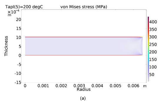 Thermal stresses in the investigated structure were evaluated in a term of von Mises stress. The von Mises stress is scalar quantity and criterion of yield very often used for metals. If the von Mises stress is greater than the yield strength of the material, then the material will yield. The distribution of von Mises stress in the piezoelectric ceramic disc coated with silver and a copper layer at 200 °C is presented in Figure 4.