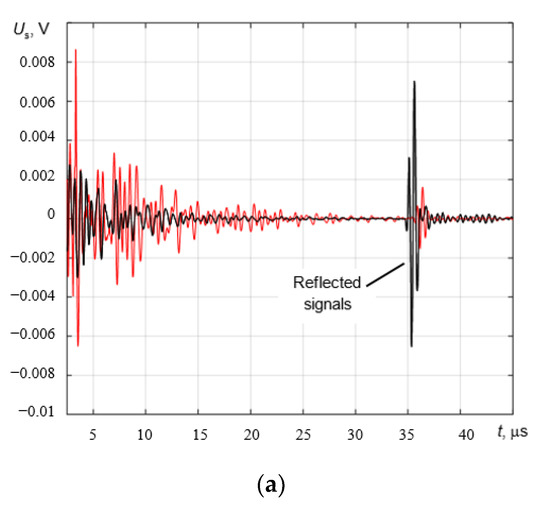 A comparison of the transducer’s reverberation signals in the temperature range (Figure 9a) shows the reverberation “tail” growing just after excitation with the increase in temperature. The reflected signal decreased at the same time. This can be explained by the deterioration of the acoustical contact between the ultrasonic transducer and the test sample with the increase in temperature. It caused the reverberation “tail” to grow, as well as a weaker acoustic contact and, as a result, a weaker reflected signal. The decrease in acoustical contact could be explained by bigger displacements of the transducer edge caused by higher stresses at higher temperatures as it follows the presented finite element modelling. As a result of such deformation of the front surface of the transducer, the thickness of the liquid contact layer increased, leading to a reduction in the amplitude of the received ultrasonic signal reflected from the bottom of the test sample.