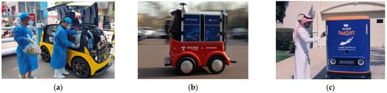 Initially, mobile robots were widely used in high-risk areas in industrial and military industries. Unmanned Aerial Vehicles (UAVs) [] and Autonomous Underwater Vehicles (AUVs) [] have gradually become the essential backbone of national armies due to their lower cost of use, easy logistical support, and lower safety risk factor. Rail-Guided Vehicles (RGVs) [] and Automated Guided Vehicles (AGV) [] are becoming an indispensable part of the automation industry chain in the industrial field due to their advantages of simple and convenient operation, strong autonomy, and high work efficiency. With the rise of Industry 4.0 and emerging technologies, mobile robots are playing an important role in search and rescue [], cargo transportation [], unmanned services [], geological exploration, and cultural entertainment []. Advances in autonomous navigation technology for mobile robots have made it possible to build unmanned delivery networks on the ground. The unmanned delivery robot developed by JD entered the road test phase in 2016 and will be put into operation soon. The technology makes it possible to achieve a large-scale and contactless delivery service of goods during an epidemic to meet the livelihood needs of a large number of consumers who are unable to travel, as shown in Figure 1. Currently, unmanned delivery robots are still severely limited in urban areas, especially in heavy and congested traffic environments. A significant portion of delivery robots are limited to areas with more fixed environments, such as campuses and communities. This still does not take advantage of unmanned delivery robots to replace people in the current epidemic environment for efficient, fast, and contactless delivery services. Therefore, the reasonable construction of unmanned distribution networks, the large-scale application of mobile robots for efficient cargo transportation, and the solution of the problem of “the last mile of cargo delivery” will bring great convenience to consumers.