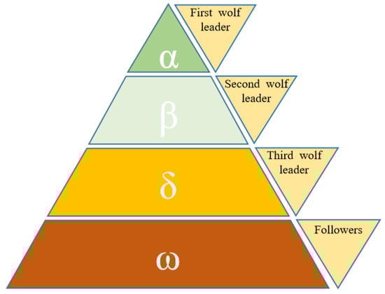 The GWO algorithm was proposed by Seyedali Mirjalili, an academic at Griffith University, Australia, and others, and was inspired by the hunting activity behavior of gray wolf packs. The GWO algorithm mathematically simulates how a gray wolf pack searches, surrounds and attacks its prey, and strictly follows the social hierarchy of the pack, with three leading wolves leading the overall action of the pack. The social hierarchy of the gray wolf pack divides the wolves into four different species, which play a role of mutual dominance in the hierarchy. Among them, Alpha () wolves, Beta () wolves, and Delta () wolves are considered as pack leaders with excellent leadership ability, while Omega () wolves are subordinate wolves following the leaders, as shown in Figure 2.