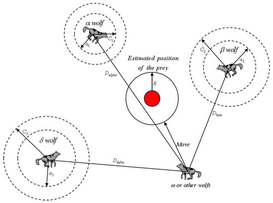 A mathematical modeling of the social hierarchy of wolves is required in the design of the GWO algorithm. Usually, during the iteration of the algorithm, the best solution is considered to be Wolf , the second and third best solutions are Wolf and Wolf , respectively, while all other alternatives are considered to be . During the search and exploration tasks performed by the GWO algorithm, the overall wolf pack’s search direction is dominated by , , and , while follows. The gray wolf is divided into three main stages in the hunting process: finding the target and approaching the prey, surrounding the prey and harassing it until the target stops moving, and finally attacking the prey.
