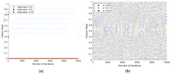 The small period nature of Tent chaotic mapping. (a) At a = 0.5 and initial values of 0.2, 0.4, and 0.8, the Tent chaotic mapping falls into a small loop, resulting in a sequence that is not chaotic in nature. (b) The random sequence generated by the Tent chaos mapping with a = 0.45 and initial values of 0.2, 0.3, and 0.15.