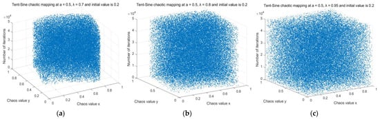 Distribution of generated sequences for Tent–Sine chaotic mapping with different parameters. (a) Tent–Sine chaotic mapping at a = 0.5, = 0.7, and initial value of 0.2. (b) Tent–Sine chaotic mapping at a = 0.5, = 0.8, and initial value of 0.2. (c) Tent–Sine chaotic mapping at a = 0.5, = 0.95, and initial value of 0.2.
