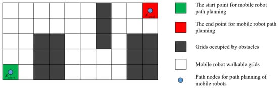 where denotes the barrier-free area where the mobile robot can travel. indicates the maximum number of grids occupied by the x-axis and y-axis of the working interval of the mobile robot.