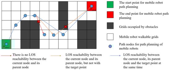 - If LOS is reached between the current node and its parent and target nodes simultaneously, the sub-individual is output and the next individual is generated. If the current node has LOS reachable only to the parent node, the current node is kept as the parent node and the path node continues to be generated. If there is no reachability between the current node and the parent node, the current node is directly discarded, as shown in Figure 8;