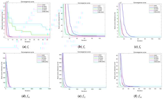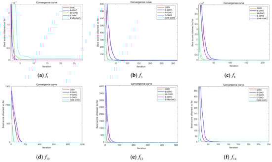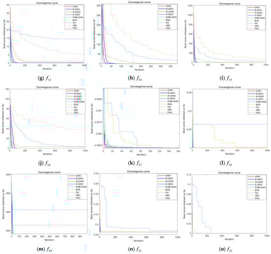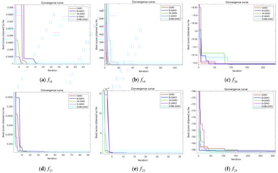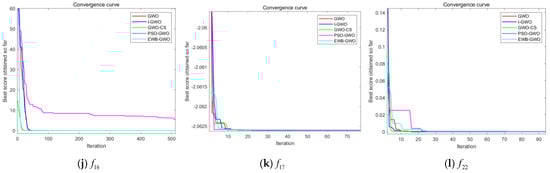The parameters about the improved GWO algorithm have been explained in the paper. The convergence curves of some experiments are shown in Figure 14. In order to better demonstrate the variability of convergence speed between the algorithms, the experimental images are enlarged to different degrees in this paper.