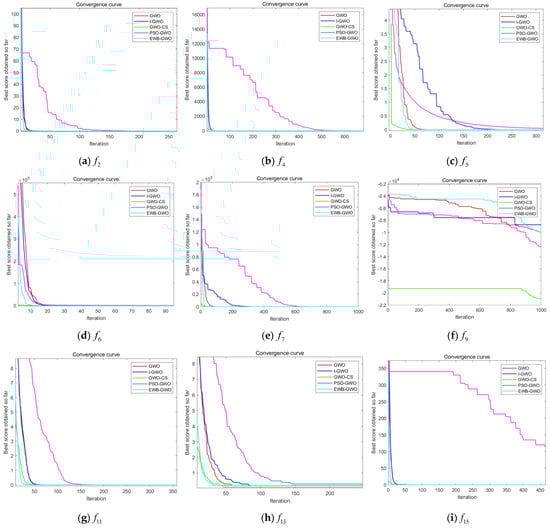 Comparison of convergence curves of GWO, I−GWO, GWO−CS, PSO−GWO, and EWB−GWO.