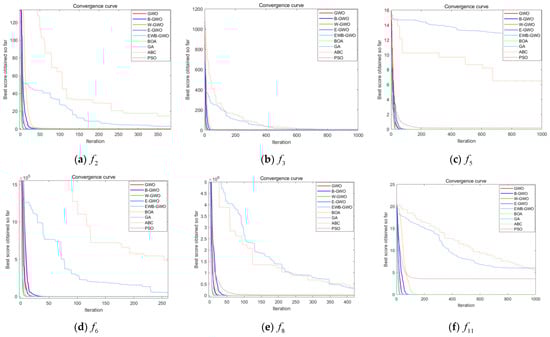 Comparison of convergence curves of GWO, B−GWO, W−GWO, E−GWO, EWB−GWO, GA, PSO, BOA, and ABC.