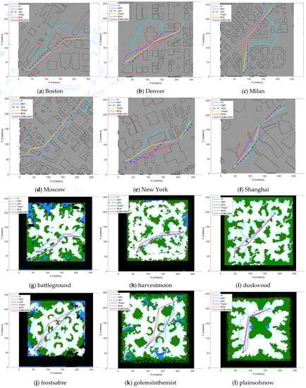 In the experiments of the EWB-GWO algorithm for mobile robot path planning, six game maps (simulating complex field environments) and six city maps from the public map dataset provided by Moving AI Lab (https://movingai.com/, accessed on 10 January 2023) were used for the algorithm comparison tests. In this paper, the information of the selected maps is organized as shown in Table 10. In the process of algorithm comparison, the A* and Jump Point Search (JPS) algorithms based on graph search technique, RRT algorithm based on probabilistic sampling, BOA algorithm based on metaheuristic technique, and Theta* algorithm based on any-angle path planning strategy were selected for this experiment to conduct cross-sectional comparison experiments among different techniques. From the perspective of fairness regarding the experimental design, the heuristic functions of the A*, Theta*, and JPS algorithms used in the path planning experiments adopted the Euclidean distance formula. The step size of the RRT algorithm was set to 1 grid distance length, and the same Bresenham’s line algorithm as the EWB-GWO algorithm was used for collision detection. The experimental results of the path planning are shown and illustrated according to the algorithm’s operation time (time complexity), path length, memory occupation size of the algorithm operation (space complexity), the number of path nodes, and path smoothness. The path smoothness was defined as the sum of the total turning angles of the path. The experimental procedure and results are shown in Figure 15.