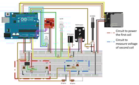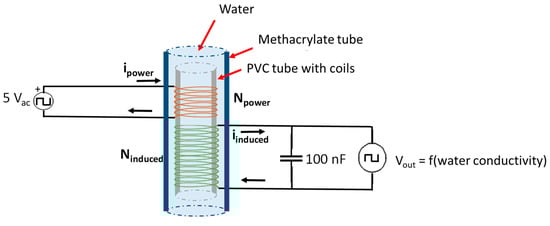 The water salinity sensor is based on the use of two different coils coiled over a PVC tube and introduced into a water sample. As is shown in [25], the principle of operation of this sensor is based on the concept of mutual inductance between a powered coil () and an induced coil (). In this case, the sensor has two coils with lengths hp and hi and a number of spires: and . Additionally, the sensor does not have a ferromagnetic core. Instead of this, it has a cylindric space, section S, which will be filled with water with concentrations of dissolved salts with a relative permeability . The solenoids are coiled over the PVC pipe with a diameter of 2.6 cm. The wire used to form the coils is enamel copper wire with a calibre of 0.4 mm. For our deployment, has 40 spires while is composed of 80 spires. Figure 1 shows the circuit used to create our water salinity sensor. As Figure 1 shows, the developed sensor is inserted inside the methacrylate tube, which is used to measure other parameters with the rest of the device. This sensor is an own design used previously as a conductivity meter.