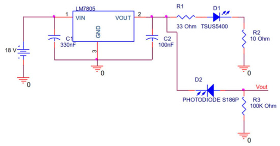 The water TSS sensor [38] is based on the use of an LED [39] and a photodiode [40] in the infrared band. The infrared LED and the photodiode are placed at a distance of 3.2 cm. Both elements work at 900 nm and are disposed at an angle of 180°. Both devices are supplied with a voltage of 5 V, which can be directly extracted from the Arduino module. An alternative to power this circuit is the use of a voltage regulator of LM7805, powered with a voltage up to 25 Volts, since this type of regulation permits a maximum output current of 1 A. Figure 2 shows the electronic circuit of our proposed system. The Vout terminal is connected to an analogue pin of the Arduino module. This sensor is an own design previously used for determining and characterising turbidity.