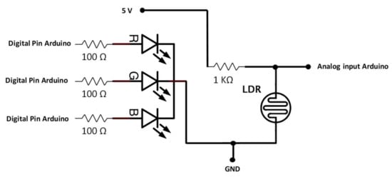 In order to improve the TSS measuring and provide the sensor with further use, an RGB LED and an LDR are used. The sample of water is illuminated by the RGB LED, and the LDR registers the amount of light that reaches it. As Figure 3 shows, the RGB LED uses a common cathode connected to the GND, while terminals that control each colour are connected to an output pin of the Arduino module through a resistor between 100 Ω and 330 Ω. On the other hand, the LDR is powered by a 5 V Arduino pin, and the voltage value, which is proportional to the amount of received light, is registered by an analogue input of the Arduino module. Additionally, a resistor of 1 kΩ is added, creating a voltage divisor to better control the amount of voltage the Arduino receives.