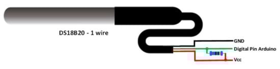 The DS18B20 temperature sensor [41], a commercial probe, is one of the most versatile sensors available on the market. This sensor is suitable when the temperature in humid or water environments should be measured since there is a waterproof probe model. The DS18B20 can measure temperatures between −55 °C and 125 °C. It has a very wide range; however, it does not have the same error in the entire range. Specifically, for temperatures between −10 °C and 85 °C, the sensor has an error of ±0.5 °C, while for the rest of the temperatures between −55 °C and 125 °C the error is ±2 °C. Figure 4 shows the electric connections of this sensor to a digital pin of an Arduino.