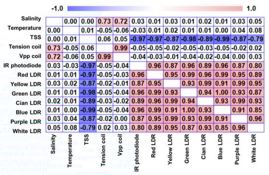 First of all, in order to evaluate if any of the target variables (temperature, salinity and TSS) might act as an interferent with the data gathering of another variable, a multivariate analysis is performed. The result of this analysis can be seen in Figure 7. The graphic depicts the correlation between included parameters and the measurement of the coil, the photodiode and the LDR with the different lights. The correlation values close to −1 and +1 indicate that the input variables are highly correlated. Meanwhile, the correlation values close to 0 indicate that variables are not correlated.