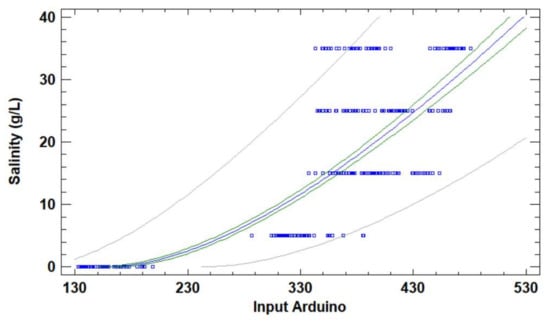 where Salinity is the value of salinity in the calibration samples and the value of salinity in analysed new samples, and is the input analogue value in the pin in which the coil is connected to Arduino.