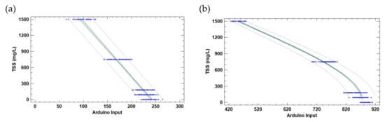 where TSS is the value of TSS in the calibration samples and the value of TSS in analysed new samples, is the input analogue value in the pin in which the IR photodiode is connected to Arduino, and , , and are the input analogue values in the pin where the LDR is connected to Arduino when different lights are used.