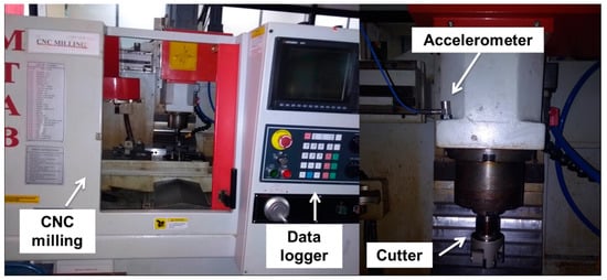 In order to undertake real-time signal acquisition, the machining experiments were performed on a CNC milling tool. The investigation based on Bayes algorithms and metaheuristic algorithm driven SVM was carried out using same experimental setup with numeric vibration data [29,30]. The setup is shown in Figure 2 which consists of a machine tool, a cutting tool mounted inside the spindle, a work material, a sensor—piezoelectric accelerometer—and a data logger. The job material was mild steel which was face milled with a cutter consisting of four tips and depth of cut of 0.2 mm, speed of 1000 revolutions per minute, and feed of 48 mm/min were selected. The machining was carried out considering six tool conditions in total. The single-axial piezoelectric accelerometer was selected. Vibration signatures developed throughout machining pass on to the spindle holder sensitively and thus when recording tool faults, any variation in spindle motion can be detected if the sensor is located near to it. For vertical milling, the component of vibration in the Z-direction is the most sensitive to tool faults rather than X and Y, so the sensor was directly attached to a spindle block in the vertical direction. A data logger was engaged to collect a time-domain response. With respect to the formula given by Nyquist, a sampling was undertaken at 24 kHz. Here, in total 240 samples were collected which means each tool label is represented by 40 samples. For testing robustness of the trained model, a separate dataset was acquired independently and served in the model as a blind dataset. While acquiring this dataset, different CNC trainers of the same model were utilized. The experimentation was carried out considering speed, feed, and depth of cut as mentioned earlier till the cutting tool failed.