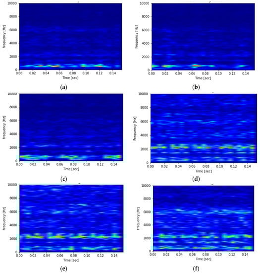Variation in vibration levels is acquired primarily in the time domain directly from the sensors used to measure its acceleration, velocity, and displacement by connecting them to the vibration DAQs. For very basic investigation, a simple vibration meter shows the intensity of vibrations with a linear measurement dependent on time such as mm/sec. Some spring mass mechanisms are used for conversion of change in motion into an electrical signal. When dynamic and random vibrations are considered, there is need for some systematic signal processing using sophisticated techniques. Conventionally, a vibration consultant or maintenance engineer used to observe vibration patterns and a decision would be undertaken regarding fault diagnosis with their experience. These specialists used to recognize signatures through their knowledge, but the assessment was very subjective. A very well-known method of transforming time-domain signal into frequency-domain signal is Fast Fourier Transform (FFT). Basically, Fourier Transform (FT) is used when there is need for non-periodic signals to be transformed into infinite harmonics of distinct frequencies and corresponding amplitudes. Usually, FT employs signal processing to recognize either time or frequency domains. However, important information about vibration patterns from the time domain disappears as FT converts non-periodic signals to infinite harmonics of distinct frequencies and corresponding amplitudes. To tackle this problem, the adoption of Short-Time Fourier Transform (STFT) is desired because it retains frequency components of local time intervals of fixed duration [34,35]. However, vibrations with fast transients (i.e., high-frequency content for a short duration) need to be analyzed using Wavelet Transform (WT). The duration of this ‘short time’ in Fourier transform serves as an important factor in comparison of STFT and wavelet as it changes in wavelet transform, thus the time window of the signal is adaptive [36]. As the frequency of signal increases, the duration of the window shortens and at the same time the frequency spectrum expands. For low-frequency signals, the window extends in time and shortens in frequency. The duration of the window for the STFT is fixed in both time and frequency. Different shades in an STFT spectrogram are an indicator of the uneven resolution of time–frequency. The window type and length determine the energy blurriness across time and frequency and time and frequency resolution in the STFT spectrogram [37]. For a larger window owing to greater blurring across time, there is a decrement in energy blurring across the range of frequencies. Conversely, a narrower window decreases blurring across time owing to greater blurring across the range of frequencies. Figure 3a–f depict the vibration signal in the form of an STFT spectrogram for six tool conditions in total (one healthy and five faulty).