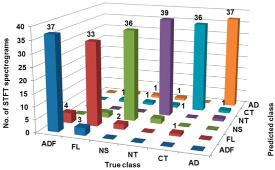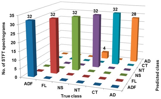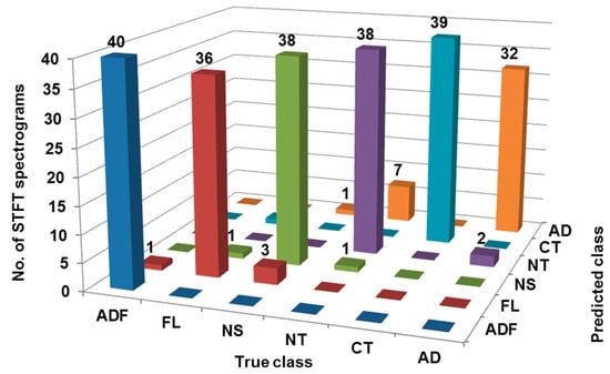 The confusion matrix from Figure 9 shows that for class ‘ADF’, only 37 STFT spectrograms are correctly classified whereas 3 were misclassified as ‘FL’. For class ‘FL’, only 33 STFT spectrograms are correctly classified whereas 4, 2, and 1 were misclassified as ‘ADF’ ‘NS’, and ‘CT’, respectively.