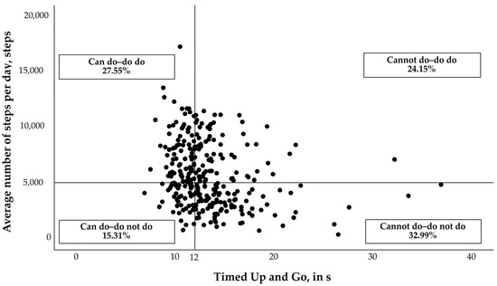 After data collection, subjects were distributed into the four subgroups of the PC-PA quadrant concept from Koolen et al. (2019). The basis for group distribution was PA (“average steps per day”, steps) and PC (“TUG”, time). Individual results were plotted among both the x (PC) and y (PA) axes. Subjects were subdivided into the four quadrants based on the following requirements: (1) “can do–do do”, high PA (number of steps per day ≥ 5000 steps [3,12]) and high PC (TUG ≤ 12 s); (2) “cannot do–do not do”, low PA (number of steps per day < 5000 steps) and low PC (TUG > 12 s); (3) “can do–do not do”, high PA and low PC; and (4) “cannot do–do do”, low PA and high PC.