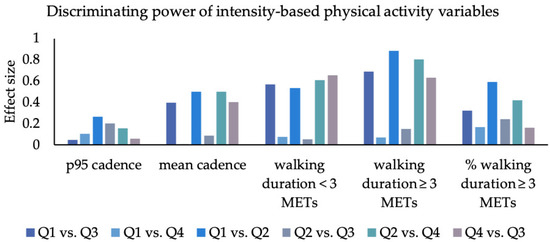 Effect size for each group comparison for intensity-based PA variables: Q1: 1. quadrant (can do–do do), Q2: 2. quadrant (cannot do–do not do), Q3: 3. quadrant (can do–do not do), Q4: 4. quadrant (cannot do–do do); P95 cadence (in steps per minute), mean cadence (in steps per min), walking duration lower 3 METs (in min), walking duration greater equal 3 METs (in min), percentage walking duration greater equal 3 METS (in min), percentage walking duration greater or equal 3 METs (in min).